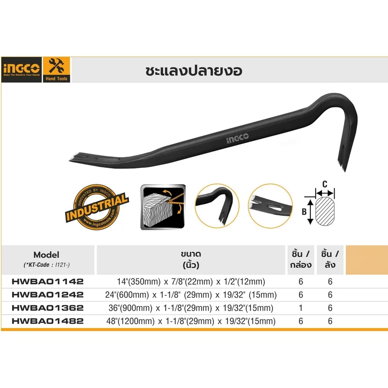 ชะแลงปลายงอ (อิงโก) INGCO รุ่น HWBA01362 ขนาด 36″(900 มม.) X 1-1/8″(29 มม.) X 19/32″ (15 มม.) เหมาะสำหรับงานรื้อถอน เจาะ ตอก แซะและงัด