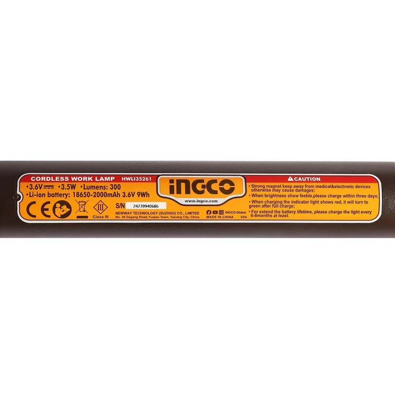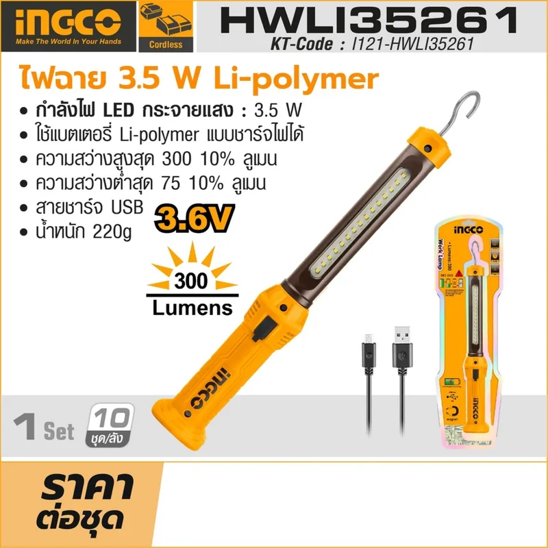 INGCO ไฟฉายพกพา Li-polymer รุ่น HWLI35261 ชาร์จไฟได้ กำลังไฟ 3.5 วัตต์ ความสว่างสูงสุด 300 ±10% ลูเมน (อิงโก้)