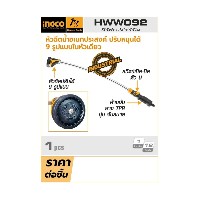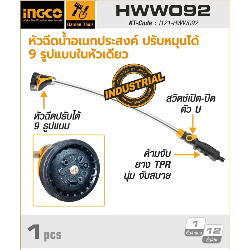 หัวฉีดน้ำอเนกประสงค์ (อิงโก) INGCO รุ่น HWW092 สามารถปรับหมุนได้ 9 รูปแบบในหัวเดียว สวิตซ์เปิด-ปิด สไตล์ตัว U