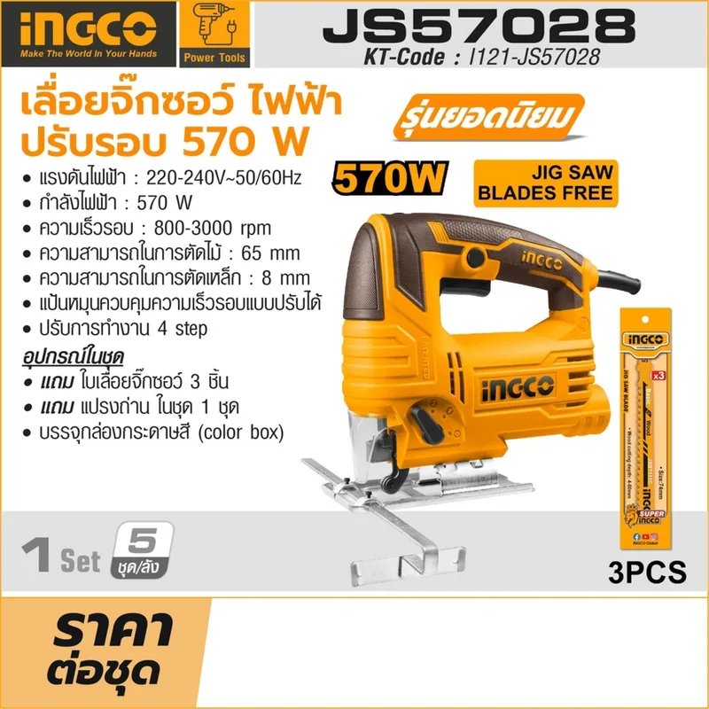 INGCO เลื่อยจิ๊กซอร์ไฟฟ้า 570 วัตต์ รุ่น JS57028 ความเร็วรอบ 800-3000 รอบ/นาที ปรับรอบได้ (อิงโก้)