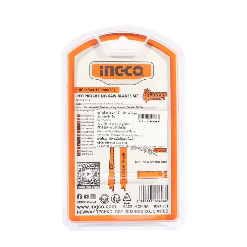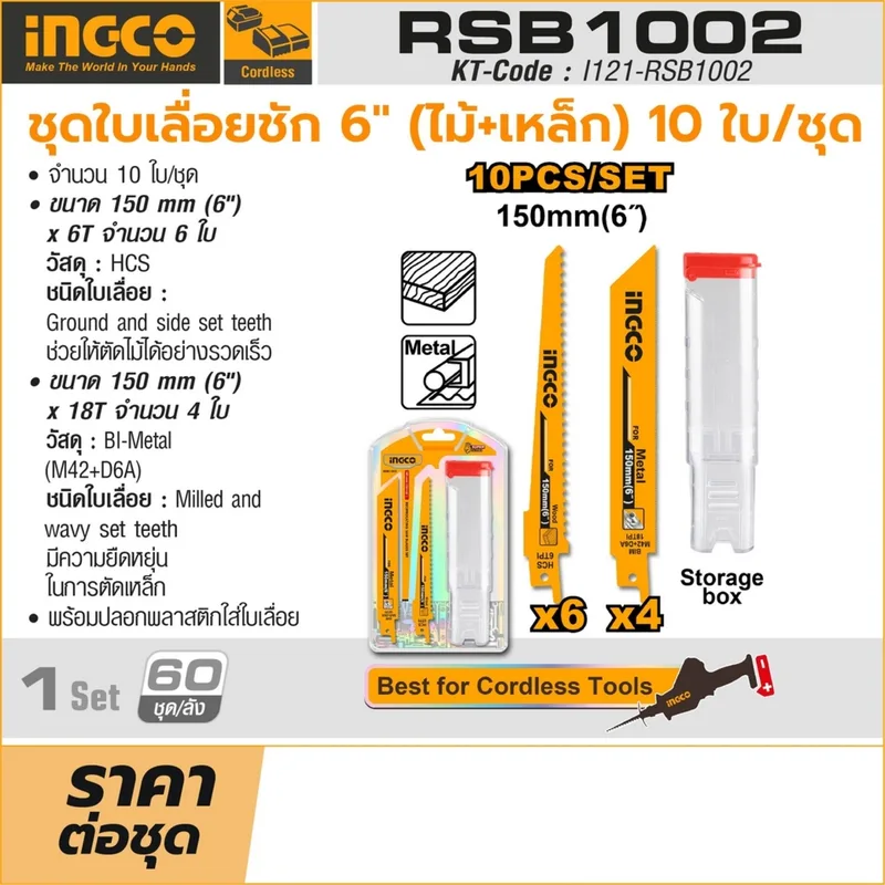 INGCO ชุดใบเลื่อยชัก 6 นิ้ว (ตัดไม้+เหล็ก) 10 ใบ/ชุด รุ่น RSB1002