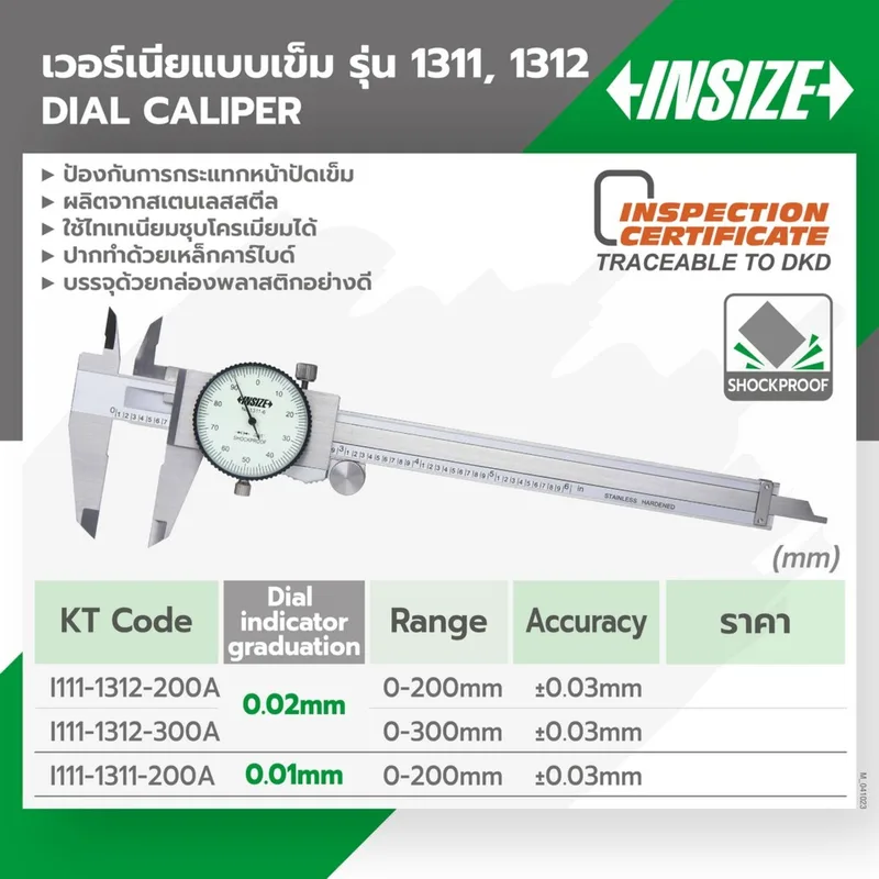 INSIZE ไดอัลคาลิเปอร์ (เวอร์เนียร์แบบหน้าปัด) ช่วงวัด 0-300 มม. ความละเอียด 0.02 มม. รุ่น 1312-300A