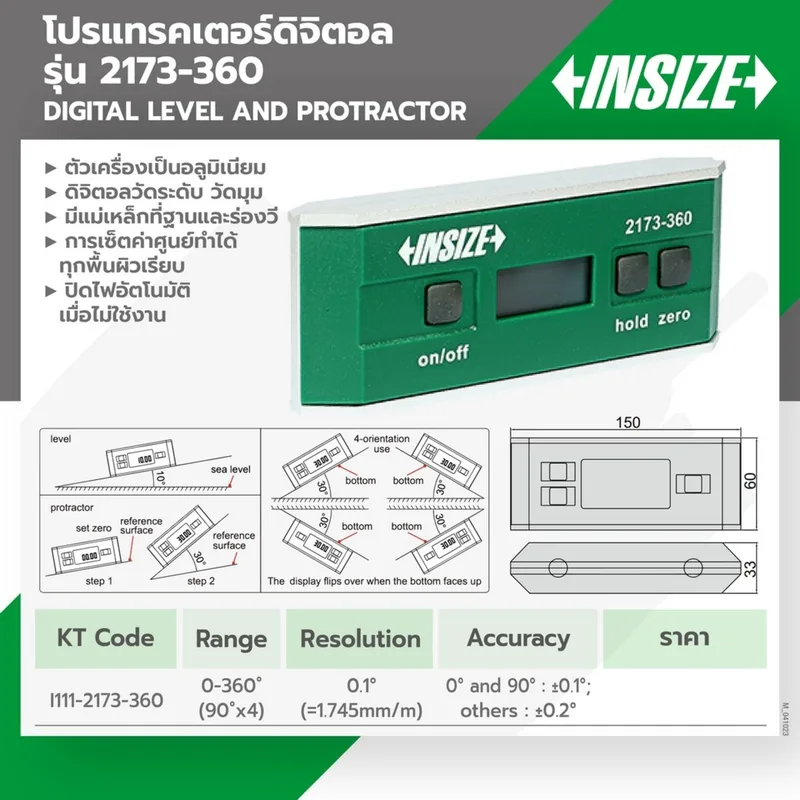 INSIZE 2173-360 เครื่องวัดระดับและมุมดิจิตอล (Digital Level and | Protractor) | เป็นเครื่องมือวัดระดับและมุมแบบดิจิตอล | ที่ออกแบบให้ใช้งานได้ทั้งแนวราบและแนวเอียง เหมาะสำหรับงานช่าง งานกลึง | งานติดตั้งเครื่องจักร และงานวัดความเอียงของพื้นผิวต่างๆ