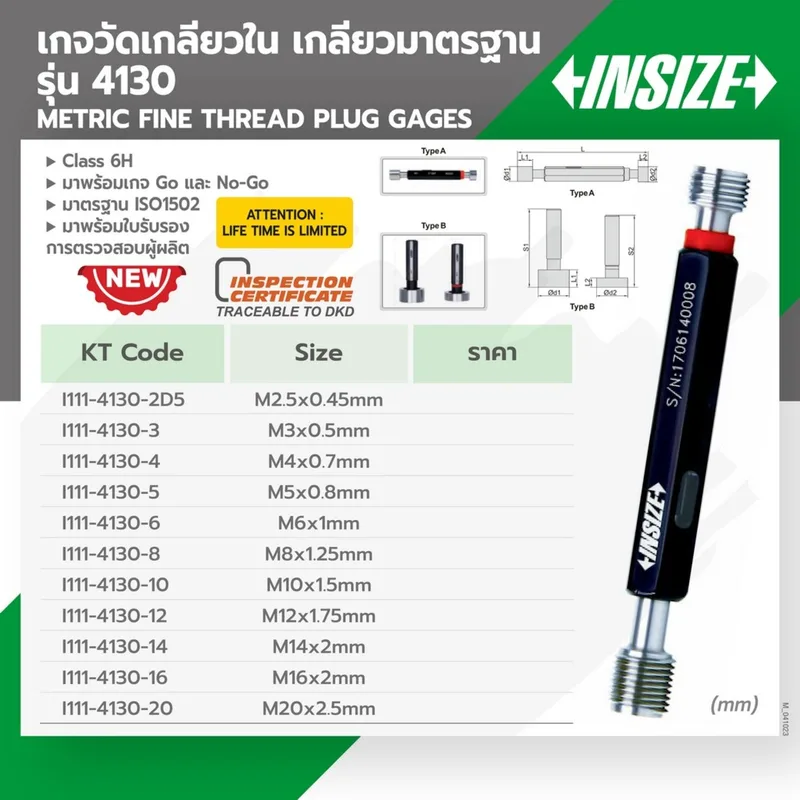 INSIZE เกจวัดเกลียวใน-เกลียวมาตรฐาน M10X1.5mm รุ่น 4130-10 Class 6H พร้อมเกจ Go และ No-Go มีใบรับรองในกล่อง (อินไซส์)