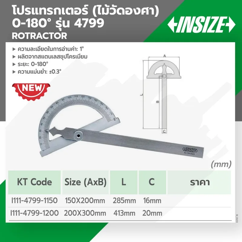 โปรแทรกเตอร์ (ไม้วัดองศา) INSIZE รุ่น 4799-1200 วัดมุม 0-180°