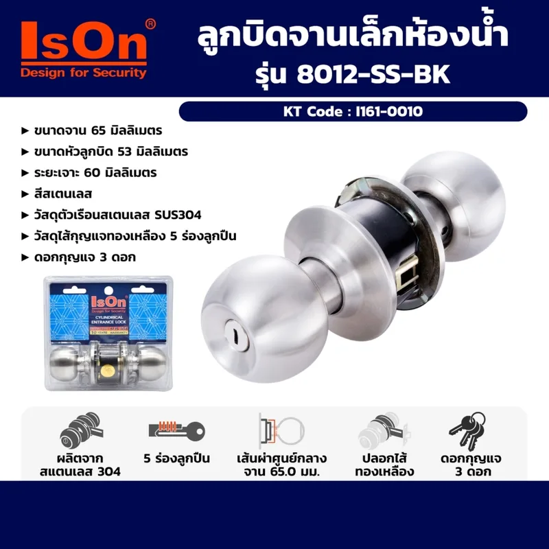 ISON ลูกบิดประตูห้องน้ำ หัวกลม จานเล็ก รุ่น 8012-SS-BK วัสดุตัวเรือนสเตนเลส 304 ขนาดจาน 65 มม. (อีสออน)
