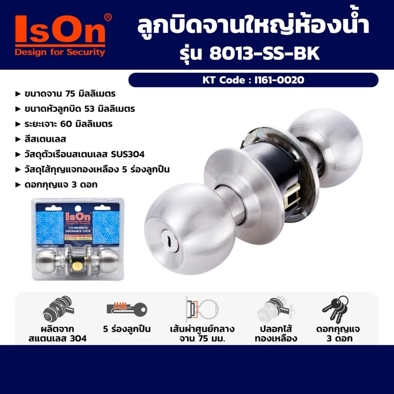 ISON ลูกบิดประตูห้องน้ำ หัวกลม จานใหญ่ รุ่น 8013-SS-BK วัสดุเรือนสเตนเลส 304 ขนาดจาน 60 มม. (อีสออน)