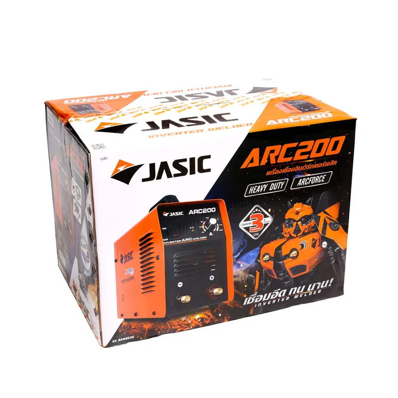 เครื่องเชื่อมอินเวิร์ทเตอร์ เจสิค (JASIC)รุ่น ARC200กระแสเชื่อม200แอมป์ คุณภาพสูง เป็นเครื่องเชื่อมระบบ อินเวอร์เตอร์แบบ MMA (Manual Matal Arc Welding) สามารถเชื่อมเหล็ก สแตนเลส อลูมิเนียม ใช้กับลวด เชื่อมทั่วไปได้เกือบทุกชนิด มีระบบป้องกัน Over-voltage Over-current และระบบกันไฟกระชากทำให้กระแส ไฟเชื่อมคงที่ แนวเชื่อมจึงมีความเรียบและสวยงาม ขนาดเครื่องกระทัดรัด น้ำหนักเบาพร้อมมือจับด้านบนตัวเครื่อง