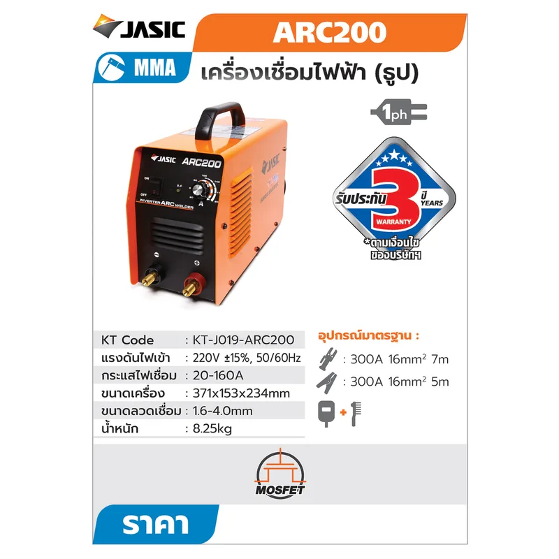 JASIC เครื่องเชื่อมอาร์ค (MMA) 200A ระบบ INVERTER 1 เฟส 220V รุ่น ARC200