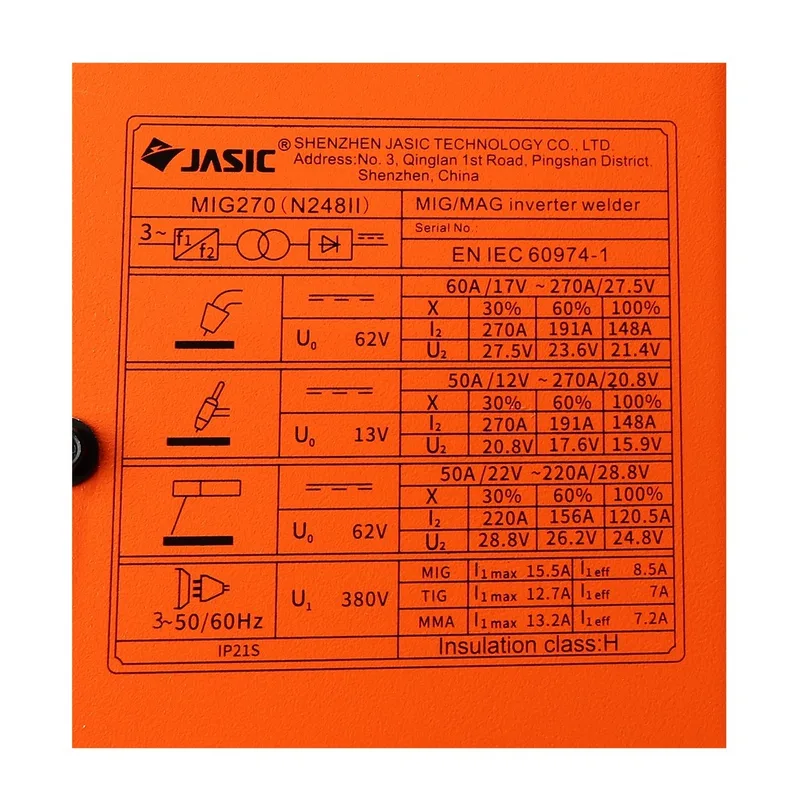 JASIC (เจสิค) เครื่องเชื่อม MIG, MMA, Lift TIG รุ่น MIG270N248II แรงดันไฟ 3 เฟส 380 โวลต์ ระบบเช็คแก๊สและเช็คลวด ระบบป้องกัน IP21S