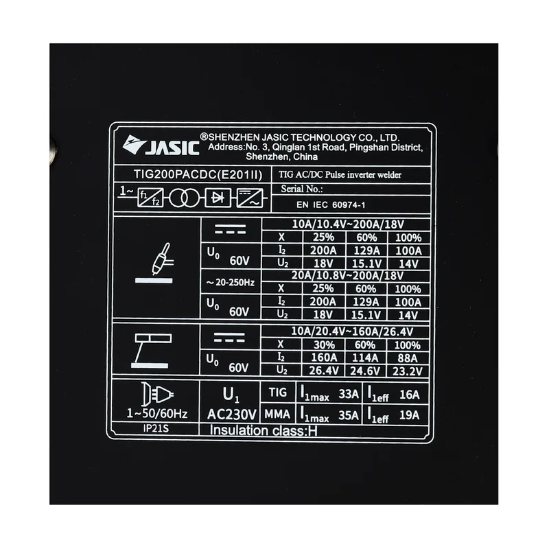 JASIC เครื่องเชื่อม TIG / MMA รุ่น TIG200PACDC E201II 1 เฟส 6 KVA TIG Pulse AC/DC ระบบป้องกัน IP21S (เจสิค)