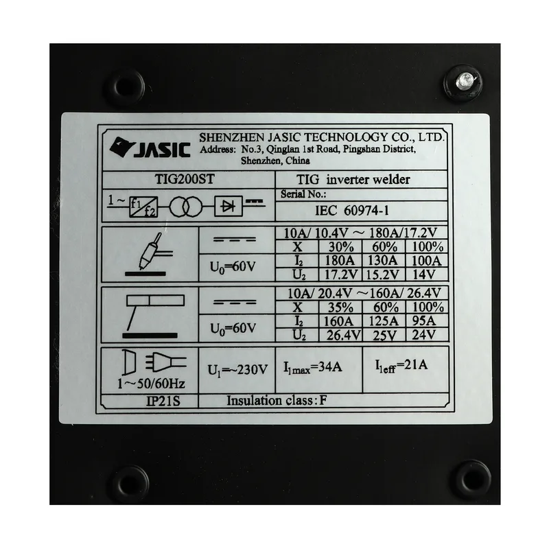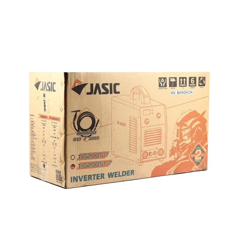 เครื่องเชื่อม JASIC รุ่น TIG200ST-7 แรงดันไฟเข้า – 1เฟส 220V ±15% , 50/60HZ กำลังไฟเข้า – 6.16KVA แรงดันไฟขณะไร้ภาระ – 56V