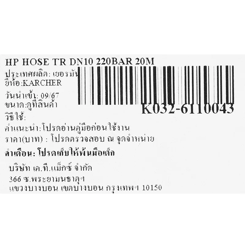 KARCHER อะไหล่ Spare Part HP HOSE TR DN10 220BAR 20M Code 6.110-043.0 (คาร์เชอร์)