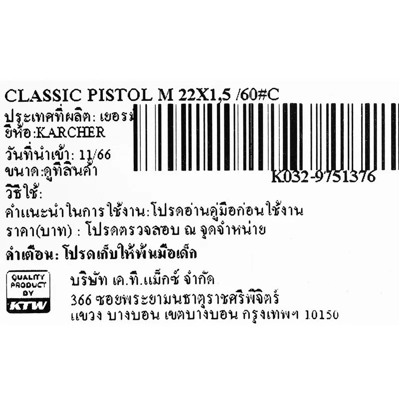 Karcher อะไหล่ Spare Part CLASSIC PISTOL M 22X1,5 /60°C Code 9.751-376.0