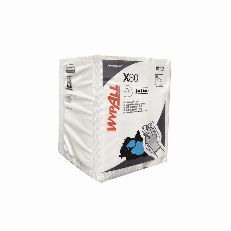 กระดาษเช็ดทำความสะอาดสำหรับงานอุตสาหกรรม สีขาว ชนิดแผ่น คิมเบอร์ลี่ย์-คล๊าค (KIMBERLY CLARK) รุ่น 94102 Wypall X80 ขนาด 28×35 ซม. หนา 80 มม. ดูดซับของเหลวได้ดีทั้งน้ำมัน หรือ ของเหลวอื่นๆ นำกลับไปซักเพื่อใช้ซ้ำได้หลายครั้ง ปริมาณฝุ่นขุยต่ำ (60 แผ่น/แ