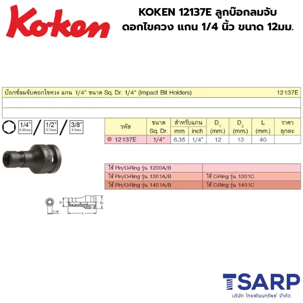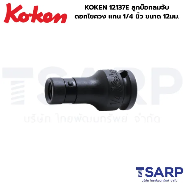 - KOKEN ลูกบ๊อกลมจับดอกไขควง รุ่น 12137E คืออะแดปเตอร์สำหรับงาน Impact (แรงกระแทก) ที่ออกแบบมาเพื่อเปลี่ยนบล็อกลมหรือบล็อกไฟฟ้าหัวขับขนาดเล็ก 1/4 นิ้ว ของคุณ ให้สามารถ จับดอกไขควง (Bit) หรือดอกขันชนิดต่าง ๆ ที่มีขนาดก้าน 12 มม. ได้