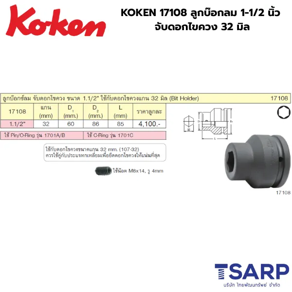 - KOKEN ลูกบ๊อกลม 1-1/2 นิ้ว รุ่น 17108 คือเครื่องมือระดับสุดยอดที่ออกแบบมาเพื่อรองรับแรงบิดและแรงกระแทกที่รุนแรงที่สุดในโลกอุตสาหกรรม ลูกบ๊อกซ์นี้ทำหน้าที่เป็นอะแดปเตอร์ที่เปลี่ยนเครื่องมือ บล็อกลม Impact หัวขับขนาดมหึมา 1-1/2 นิ้ว ให้สามารถ จับดอกไขควง (Bit Driver) ขนาดใหญ่ถึง 32 มม. ได้อย่างมั่นคง