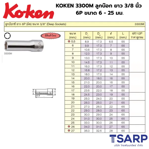 KOKEN 3300M ลูกบ๊อก ยาว 3/8 นิ้ว 6P ขนาด 6 – 25 มม.