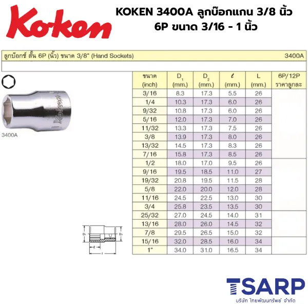| KOKEN 3400A-7/8 ลูกบ๊อก 3/8นิ้ว-6P-7/8นิ้ว | 7/8 นิ้ว | 32 | 140 |