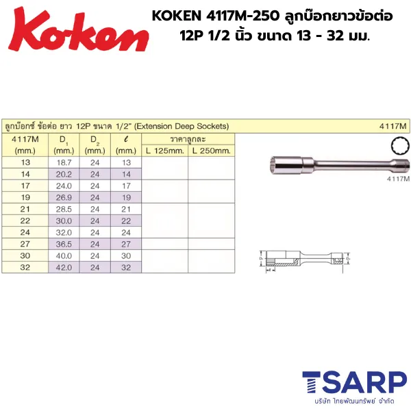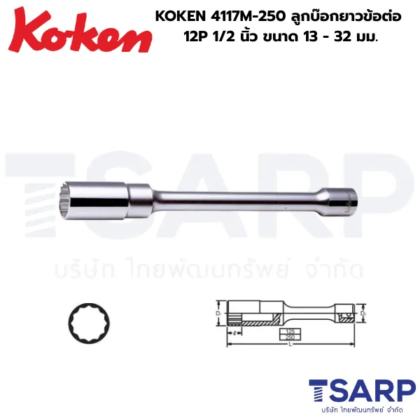 KOKEN 4117M-250 ลูกบ๊อกยาวข้อต่อ 12P 1/2 นิ้ว ขนาด 13 – 32 มม.
