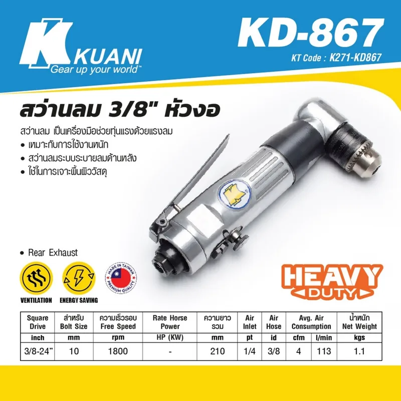 KUANI สว่านลม 3/8 นิ้ว หัวงอ (Angle Drill) รุ่น KD-867 ปรับซ้าย-ขวา เหมาะสำหรับเจาะในพื้นที่แคบหรือมุมที่สว่านตรงเข้าไม่ถึง