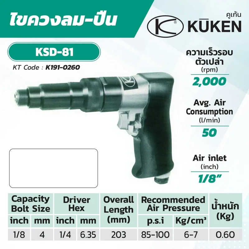 - แรงดันลมใช้งาน: 90 PSI / 6.2 bar