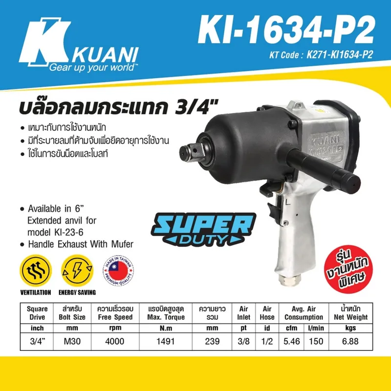 KUANI บล็อกลมกระแทก 3/4 นิ้ว Twin Hammer รุ่น KI-1634-P2 ระดับ Super Duty สำหรับงานหนักเป็นพิเศษ รถบรรทุก เครื่องจักรกลหนัก