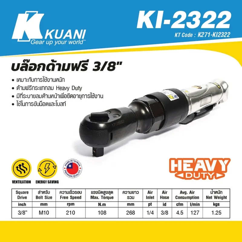 KUANI บล็อกด้ามฟรีลม (Air Ratchet Wrench) ขนาด 3/8 นิ้ว รุ่น KI-2322 Heavy Duty รุ่นใหม่ ระบายลมด้านหน้า เหมาะสำหรับงานหนัก