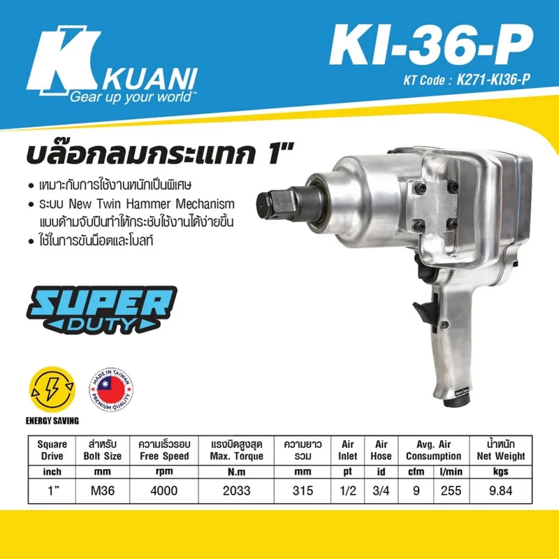 KUANI บล็อกลมกระแทก 1 นิ้ว ทรงปืน (Pistol Type) รุ่น KI-36-P ระบบ New Twin Hammer ให้แรงบิดสูงมาก เหมาะสำหรับงานหนักพิเศษ