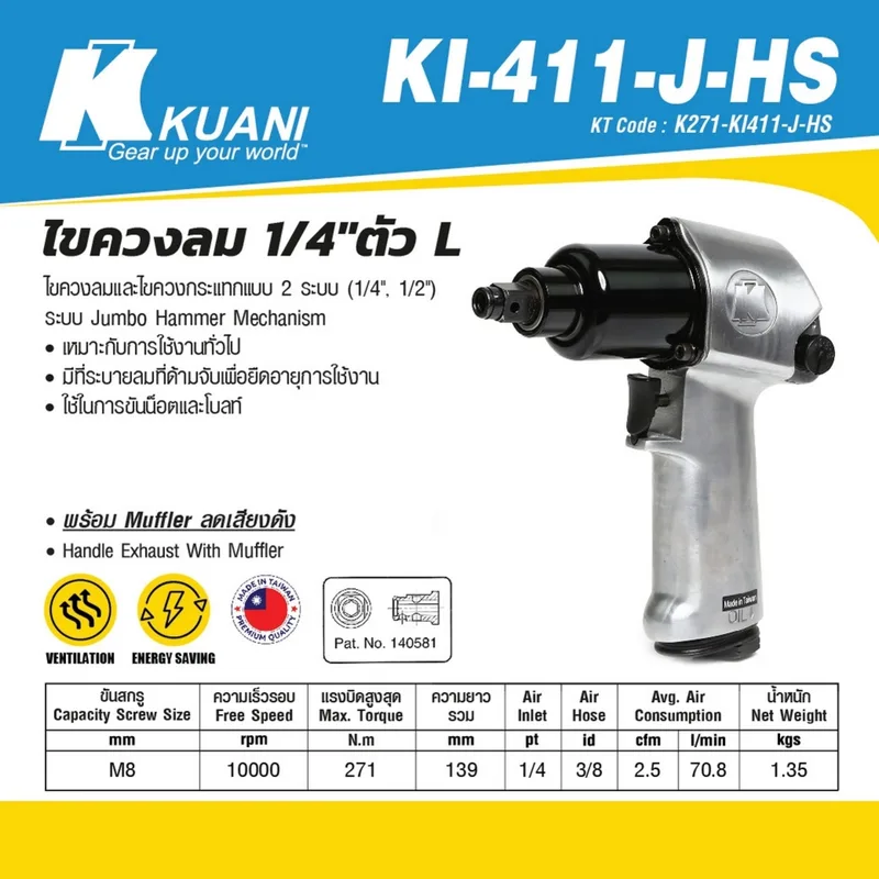 KUANI ไขควงลม 1/4 นิ้ว ตัว L รุ่น KI-411-J-HSไขควงลม