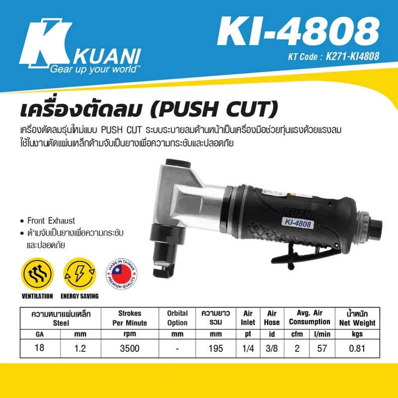 KUANI เครื่องตัดแผ่นโลหะลม รุ่น KI-4808 แบบ PUSH CUT รุ่นใหม่ ด้ามจับยาง ระบายลมด้านหน้า เหมาะสำหรับงานตัดแผ่นเหล็ก