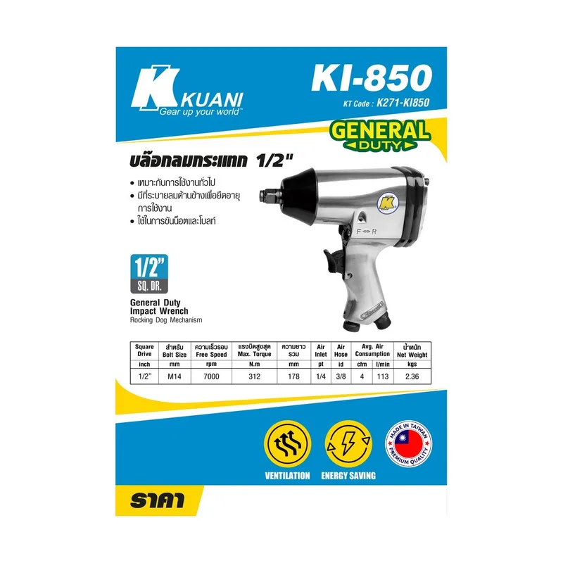 KUANI บล็อกลมกระแทก 1/2 นิ้ว รุ่น KI-850 ระบบ Rocking Dog General Duty เหมาะสำหรับงานทั่วไป ช่างบ้าน อู่ซ่อม ราคาคุ้มค่า