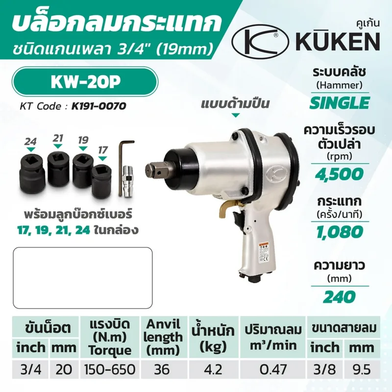 บล็อกลมกระแทก KUKEN (คูเคน) รุ่น KW-20P แกนเพลา 3/4 นิ้ว พร้อมลูกบล็อก ขันน็อต 3/4 นิ้ว (20 มม.) ความยาวแกนเพลา 36 มม. ผลิตในประเทศญี่ปุ่น
