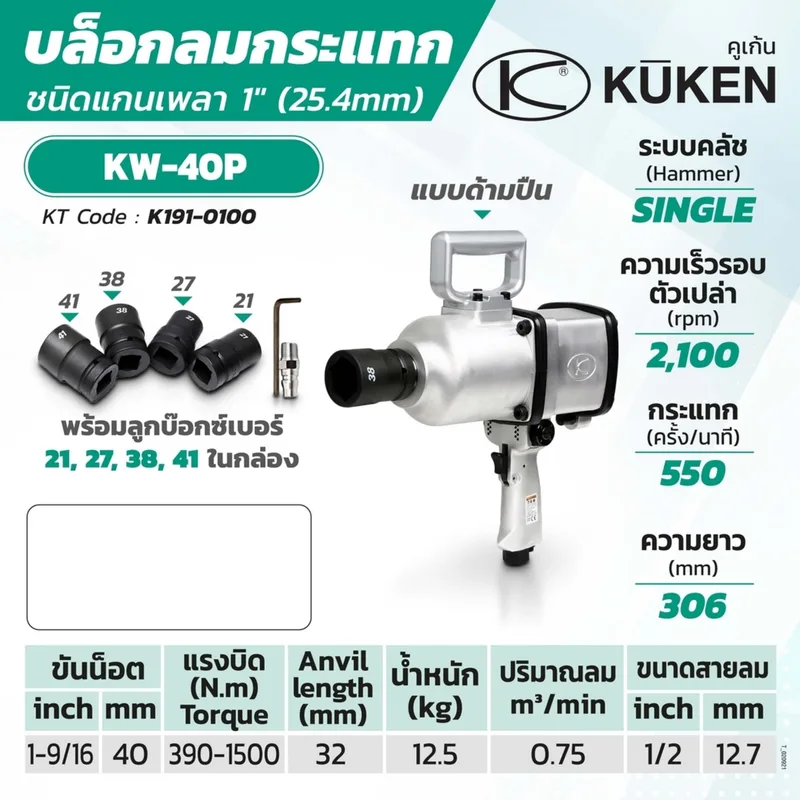 บล็อกลมกระแทก KUKEN (คูเคน) รุ่น KW-40P แกนเพลา 1 นิ้ว พร้อมลูกบล็อก ขันน็อต 1-9/16 นิ้ว (40 มม.) ความยาวแกนเพลา 32 มม. ผลิตในประเทศญี่ปุ่น