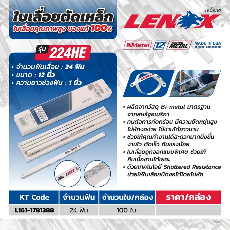 ใบเลื่อยตัดเหล็ก 12 นิ้ว 24 ฟัน LENOX รุ่น 224HE 100ใบ/กล่อง