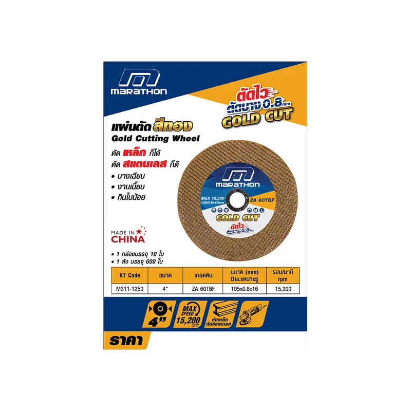 แผ่นตัดเหล็กบาง MARATHON ขนาด 4″ ความหนา 0.8 มม. — รอยตัดบาง ตัดเร็ว สำหรับงานตัดเหล็กและโลหะด้วยเครื่องเจียร์มุม