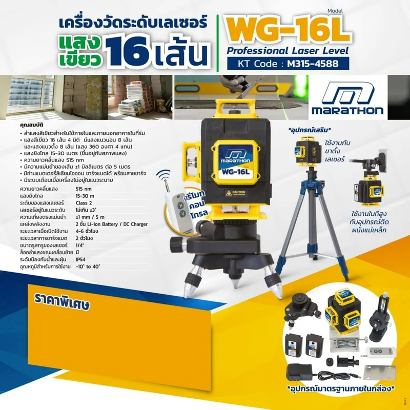 เครื่องวัดระดับเลเซอร์ แสงสีเขียว 16 เส้น MARATHON รุ่น WG-16L พร้อมขาตั้ง 1.2 เมตร