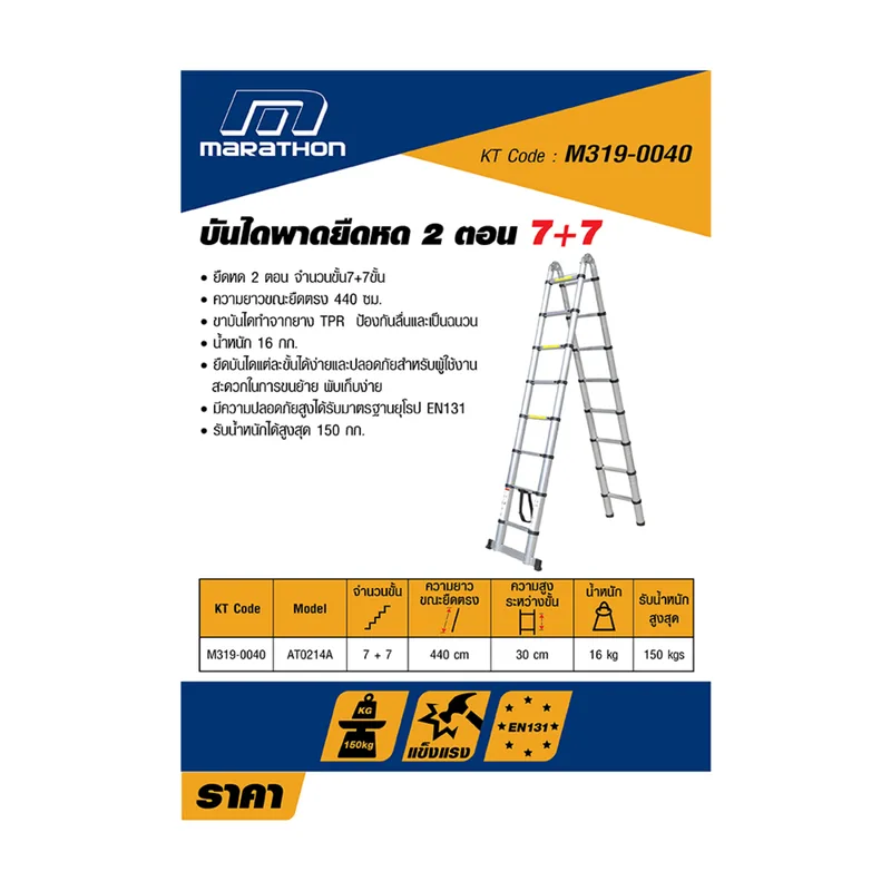 MARATHON บันไดพาดยืดหด 2 ตอน 7+7 ขั้น รุ่น AT0214A ความยาวขณะยืดตรง 440 ซม. รับน้ำหนัก 150 กก. พับได้ พกพาสะดวก (มาราธอน)
