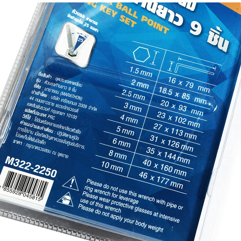 ชุดประแจแอลหกเหลี่ยม หัวบอล ก้านยาว 9 ชิ้น MARATHON ขนาด 1.5 – 10 มม.
