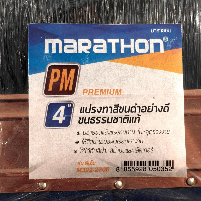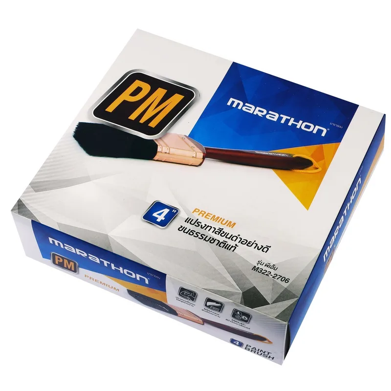 MARATHON แปรงทาสีขนดำ ขนาด 4 นิ้ว รุ่น PM ด้ามน้ำเงิน ทำจากขนสัตว์ 70% + พลาสติก 30% แข็งแรง ทนทาน พร้อมเชือก (12 ชิ้น/กล่อง) (มาราธอน)