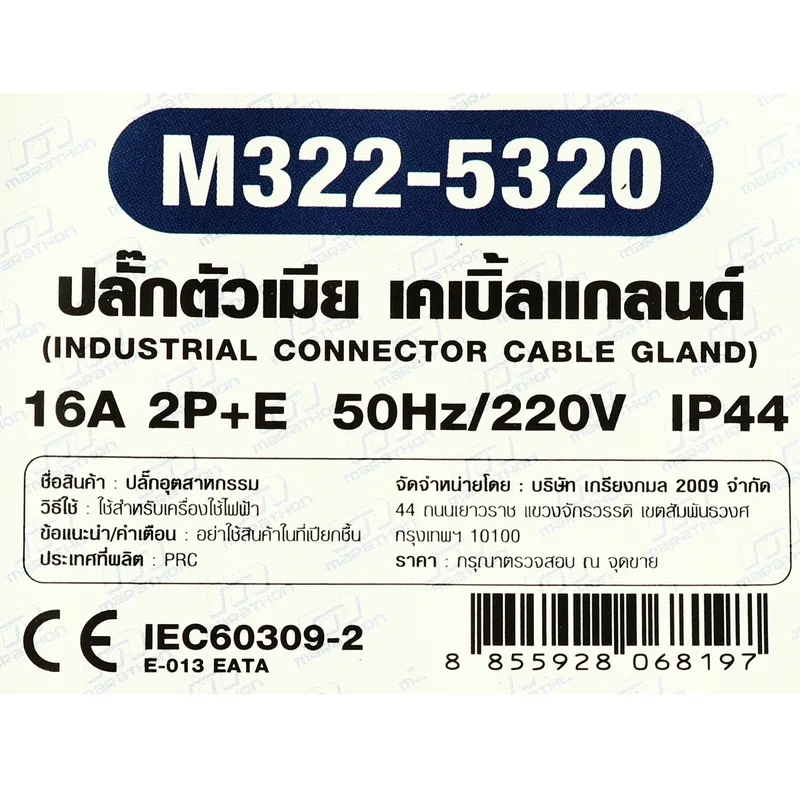 ปลั๊กอุตสาหกรรมตัวเมีย พร้อมเคเบิ้ลแกลนด์ MARATHON 16 แอมป์