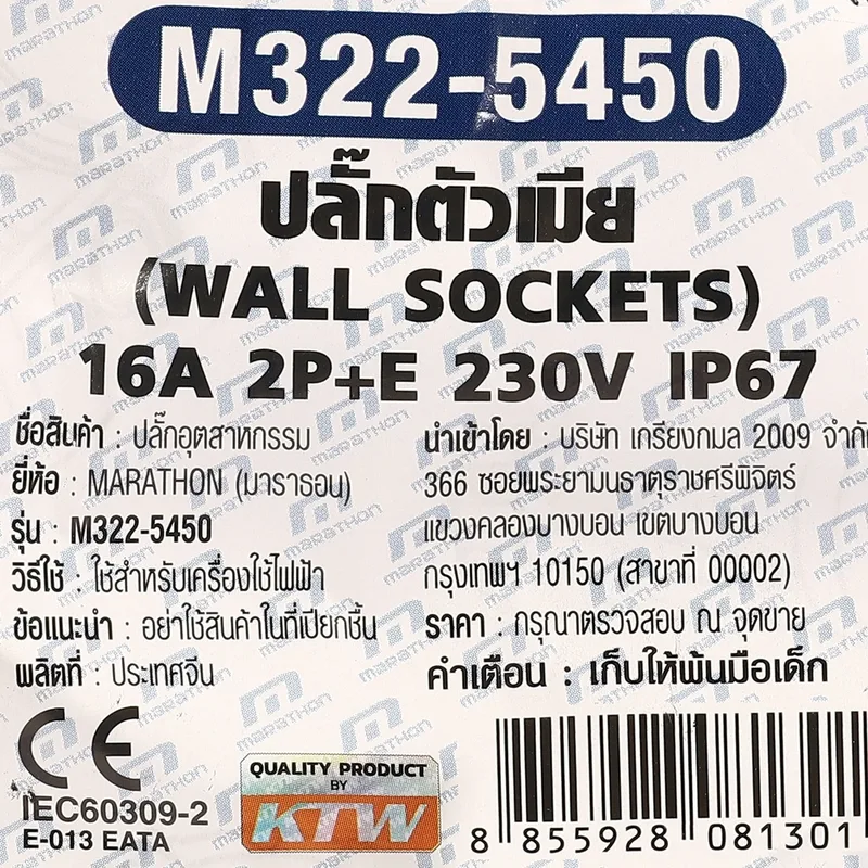 MARATHON เพาเวอร์ปลั๊กตัวเมีย ติดผนัง (ชนิดกันน้ำ) 16 แอมป์