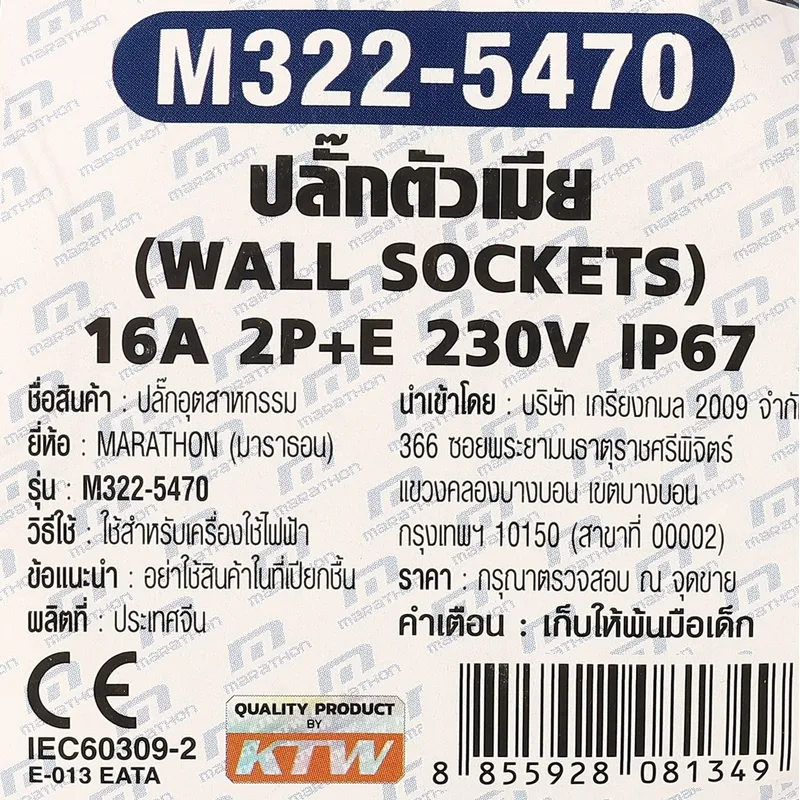 MARATHON เพาเวอร์ปลั๊กตัวเมีย ติดผนัง (ชนิดกันน้ำ) 16 แอมป์