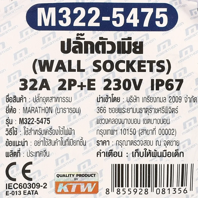 MARATHON เพาเวอร์ปลั๊กตัวเมีย ติดผนัง (ชนิดกันน้ำ) 32 แอมป์