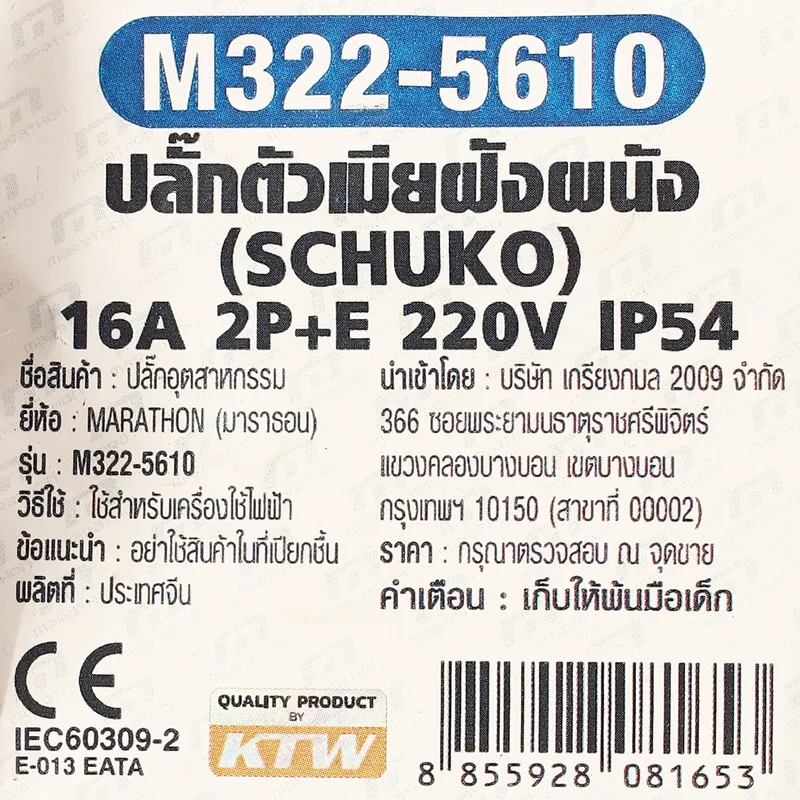 MARATHON IP54 ปลั๊กตัวเมียฝังผนัง 16A 2P+E 220V