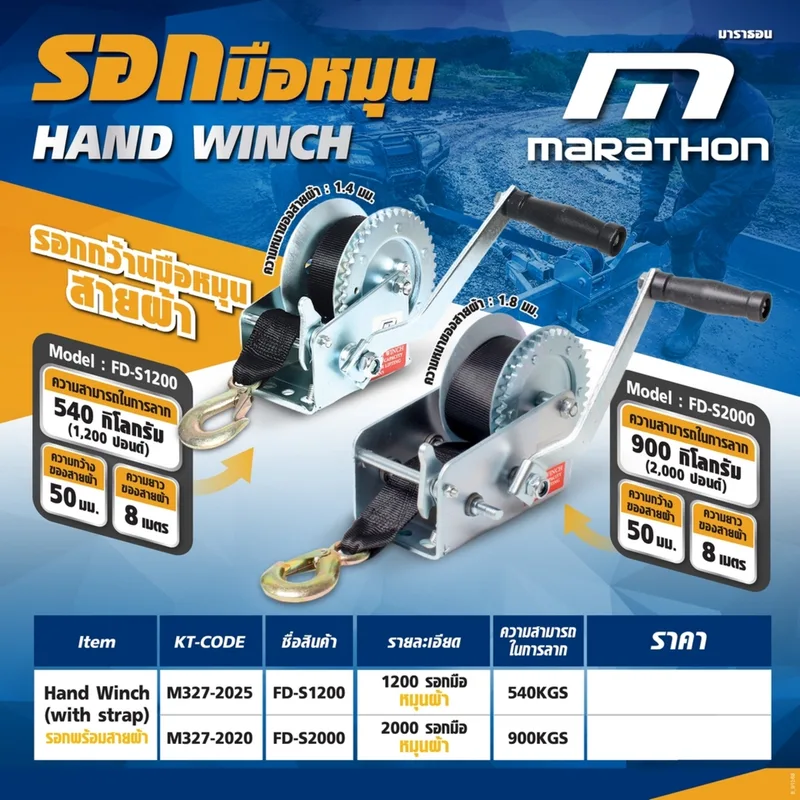 MARATHON รอกมือหมุนแบบผ้า 540 กก. รุ่น FD-S1200 ความยาวของสายผ้า 8 ม. ความกว้างของสายผ้า 50 มม. ความหนาของสายผ้า 1.4 มม. เหมาะสำหรับใช้ลากสิ่งของ (มาราธอน)