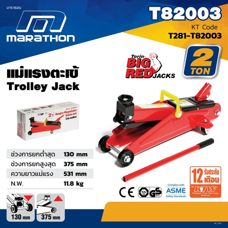 MARATHON แม่แรงตะเข้ 2 ตัน รุ่น T82003 ความสูงต่ำสุด 130 มม. ความสูงเมื่อยกสูงสุด 375 มม. (มาราธอน)