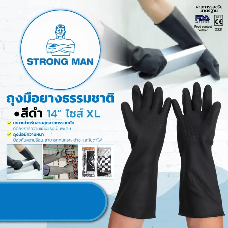 STRONGMAN ถุงมือยางธรรมชาติ ดำ 14″ไซส์ XL
