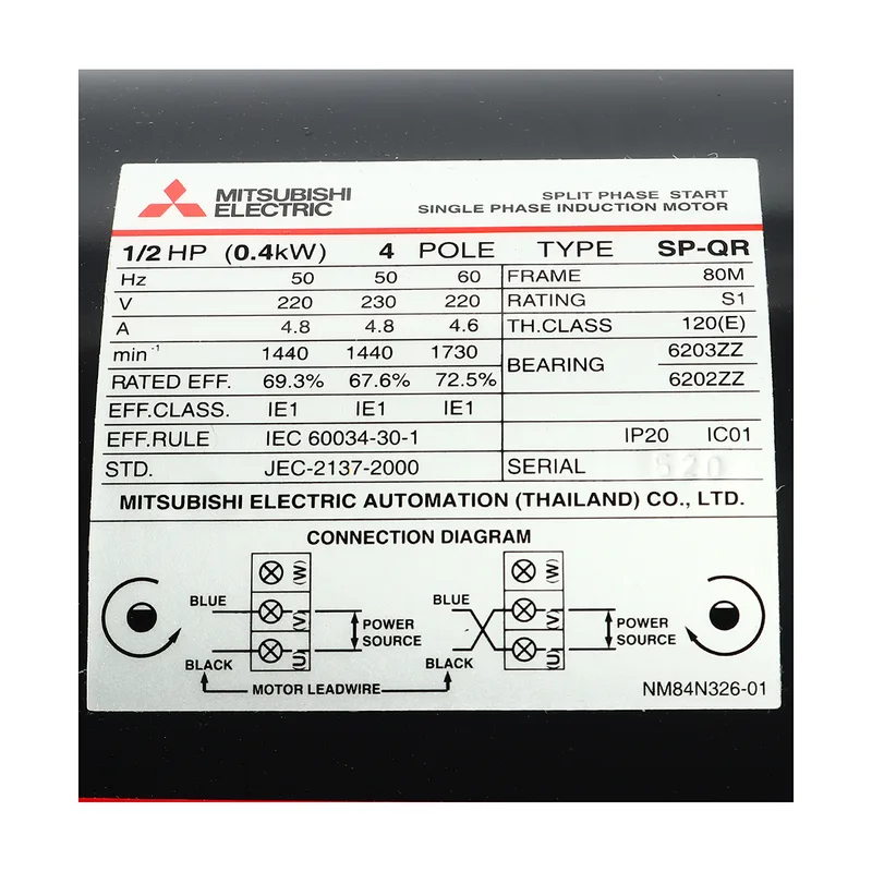 มอเตอร์ MITSUBISHI รุ่น SP-QR กำลัง 1/2 แรงม้า (0.4 กิโลวัตต์) 1 เฟส 220 โวลต์ 4 โพล 2 สาย IP20 ความเร็วรอบ 1450 RPM (รอบต่อนาที)