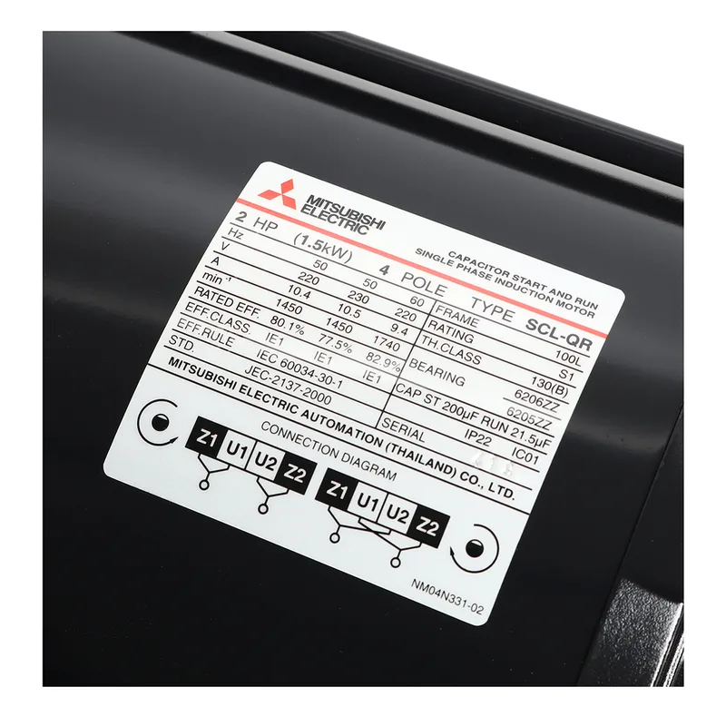 มอเตอร์ MITSUBISHI รุ่น SCL-QR กำลัง 2 แรงม้า (1.5 กิโลวัตต์) 1 เฟส 220 โวลต์ 4 โพล 2 สาย IP22 ความเร็วรอบ 1450 RPM (รอบต่อนาที)